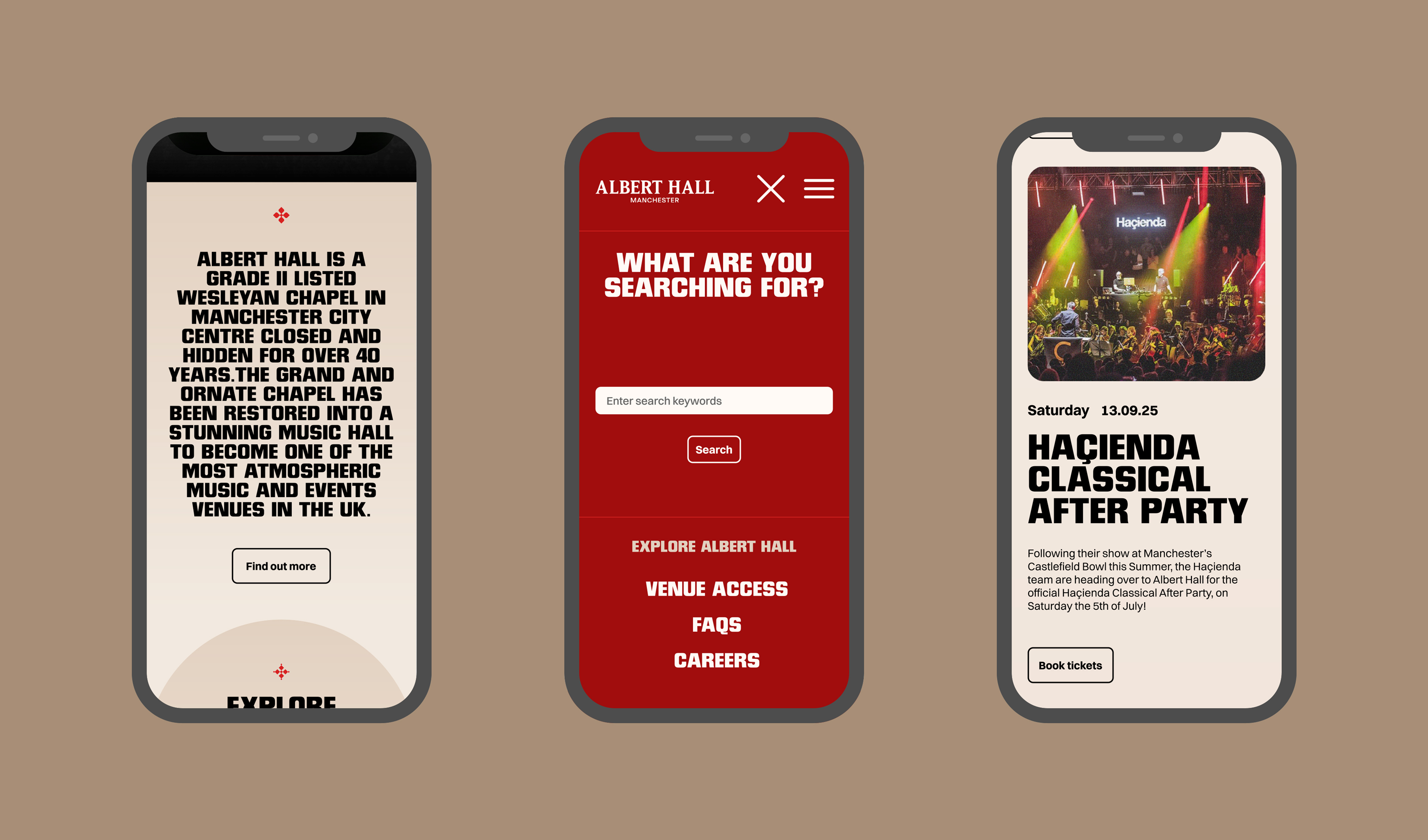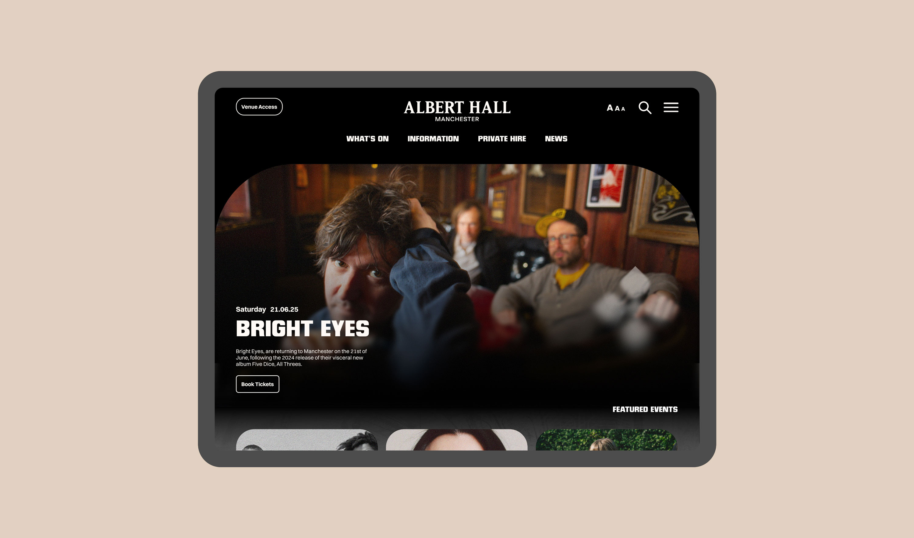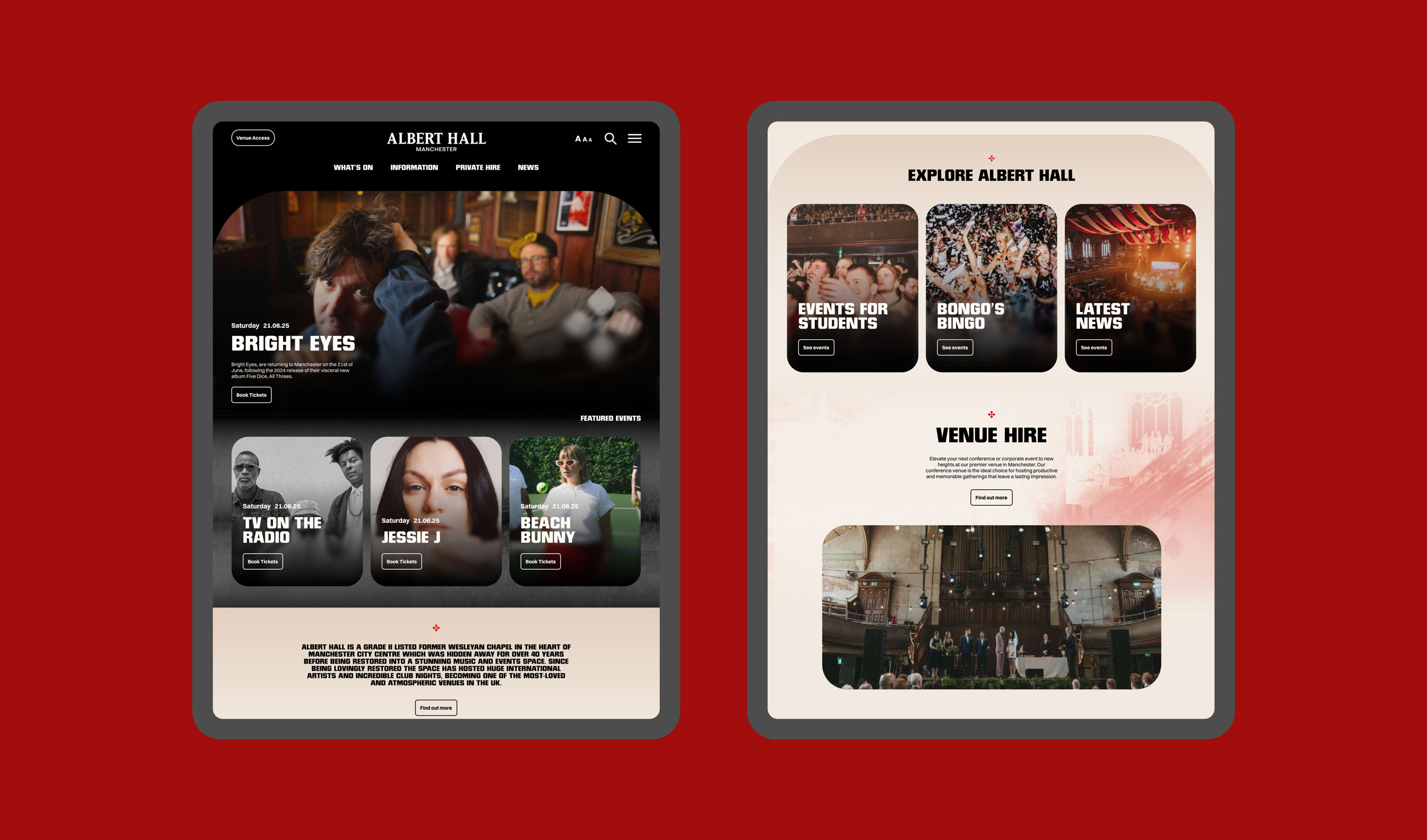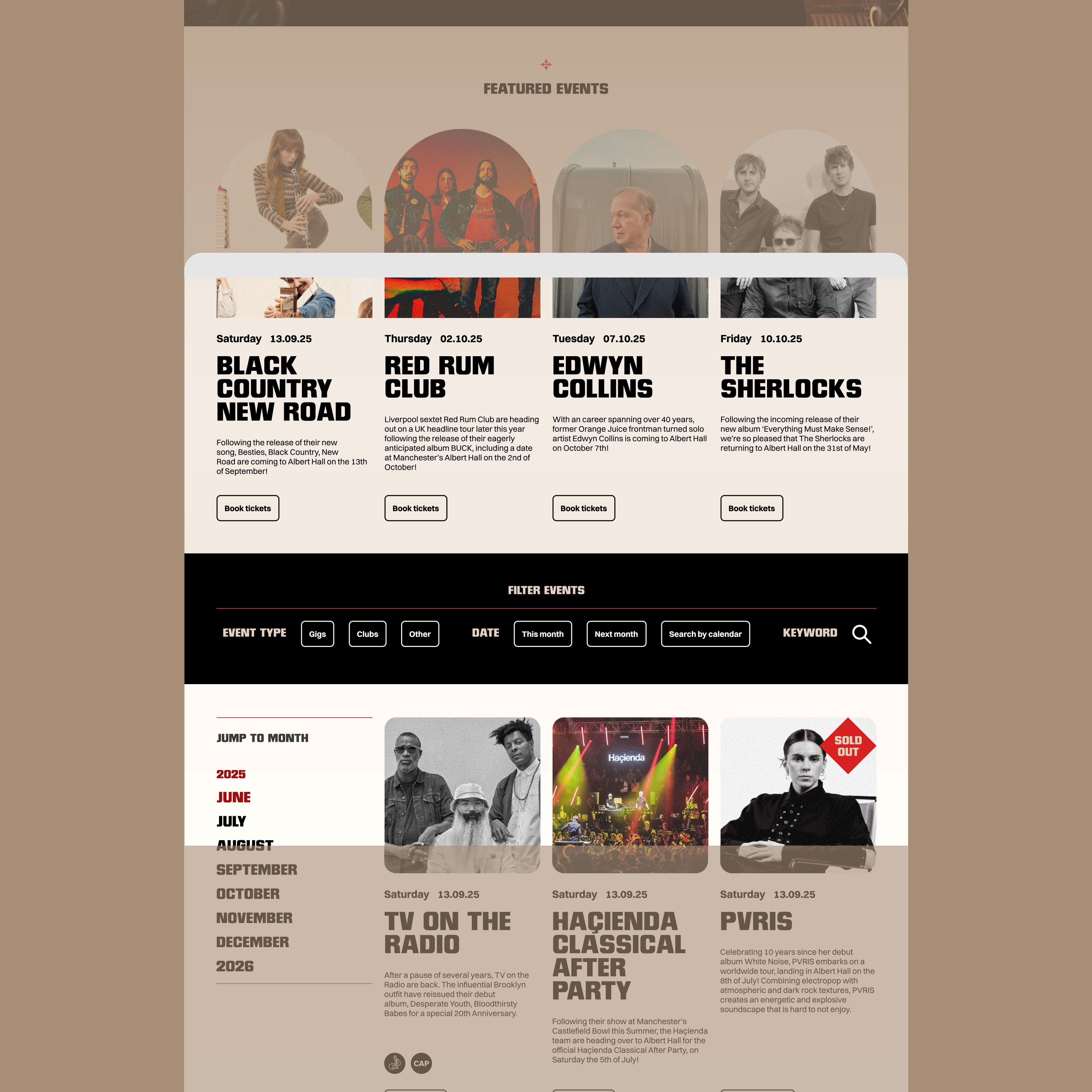 We were tasked with redesigning Albert Hall’s website, due to be launched in December 2025. Taking it from a simple events site with little traction beyond ticketing links, we helped the team at Albert Hall develop a rich platform that properly shows off the venue and the work they do.