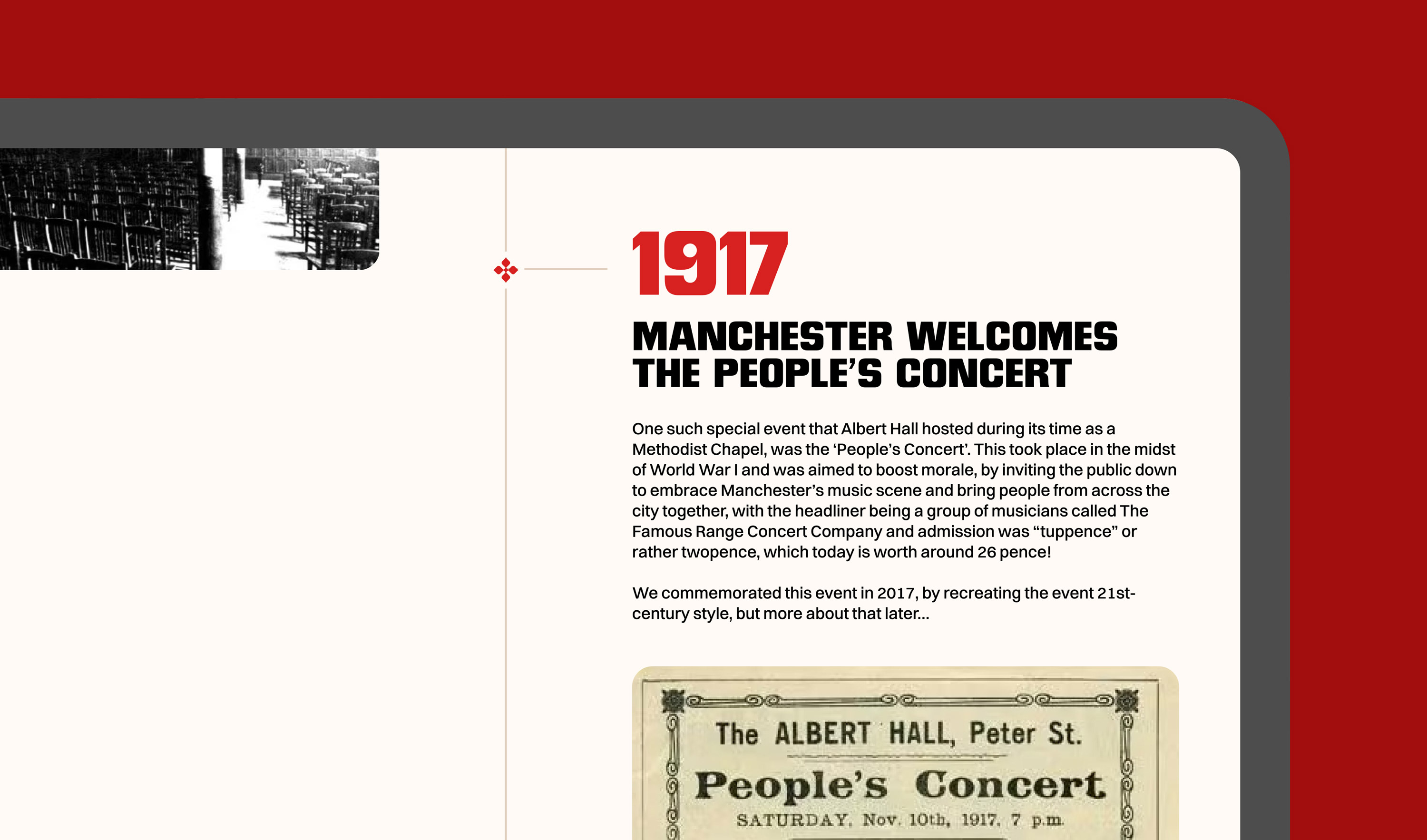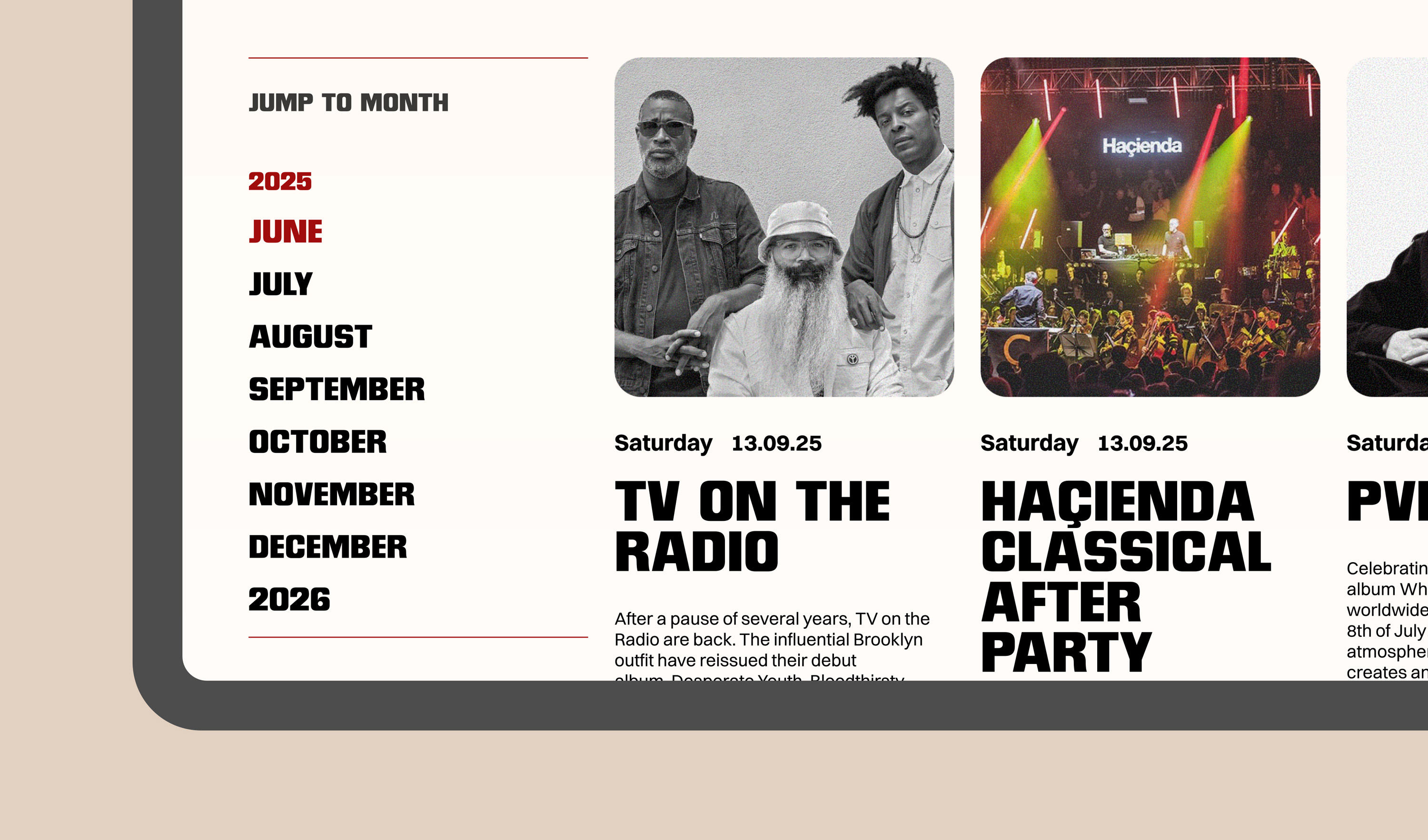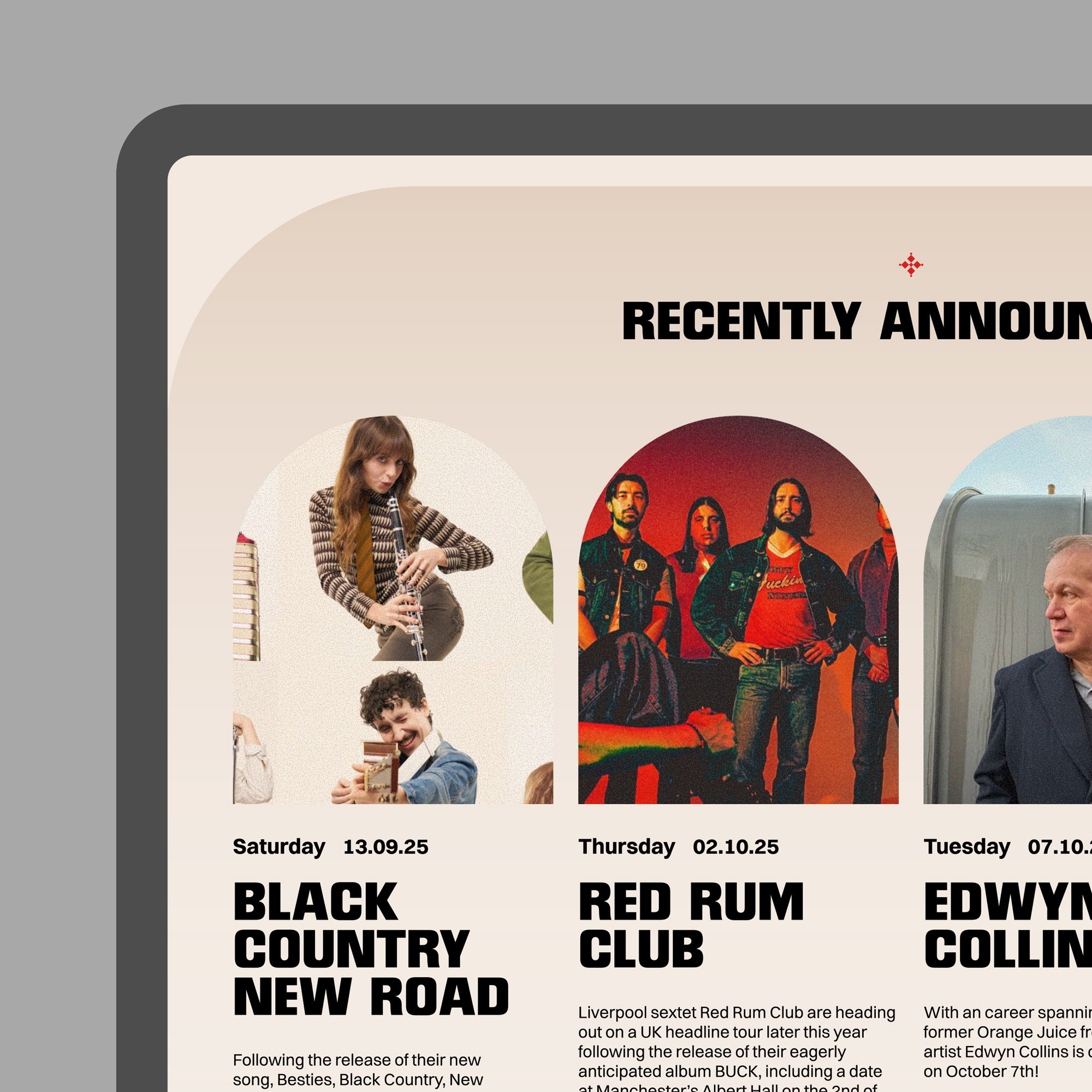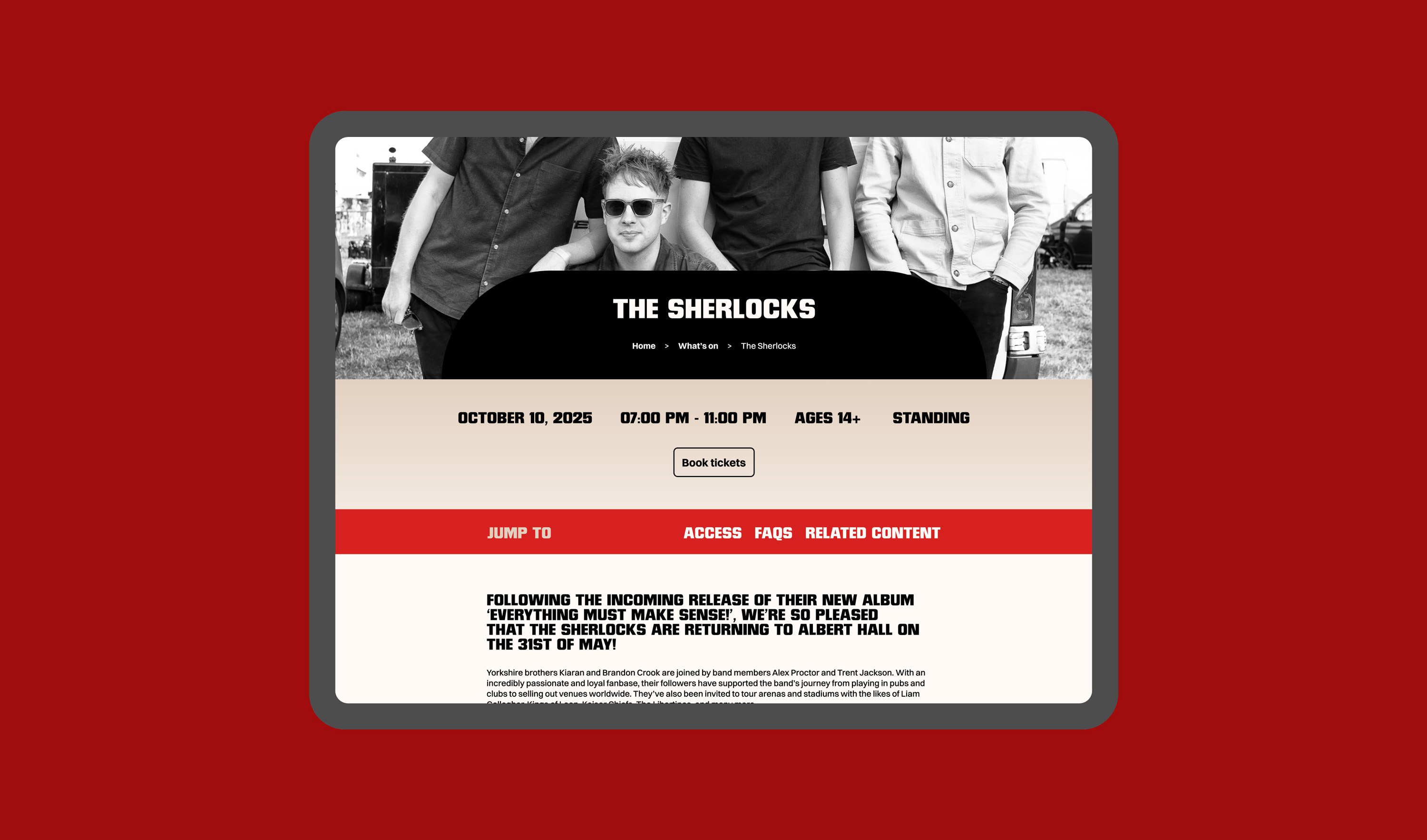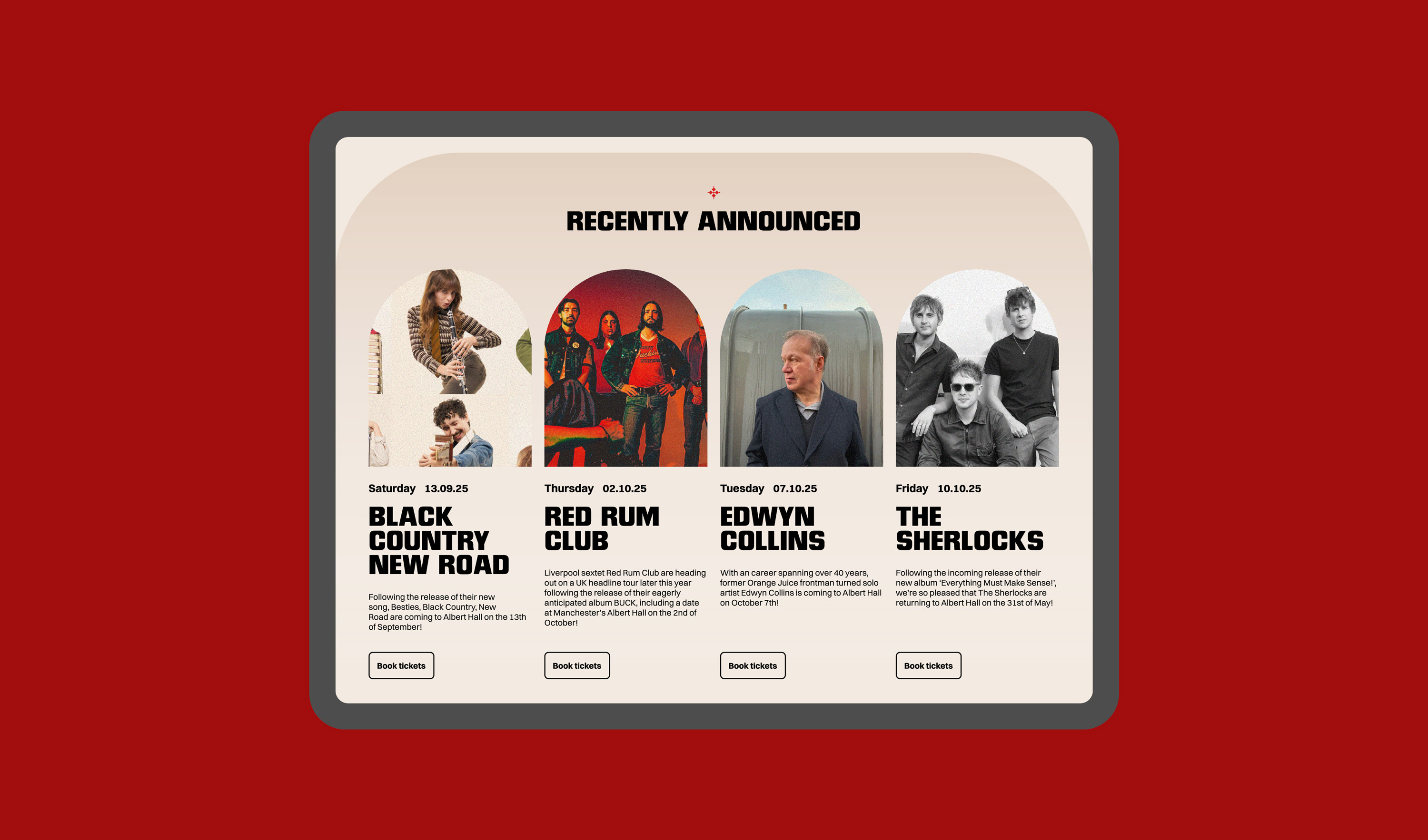 We were tasked with redesigning Albert Hall’s website, due to be launched in December 2025. Taking it from a simple events site with little traction beyond ticketing links, we helped the team at Albert Hall develop a rich platform that properly shows off the venue and the work they do.