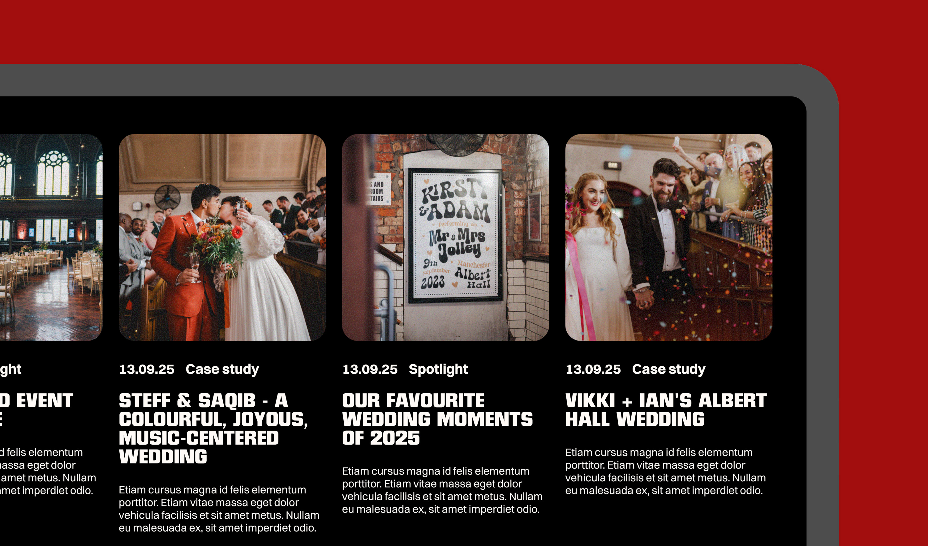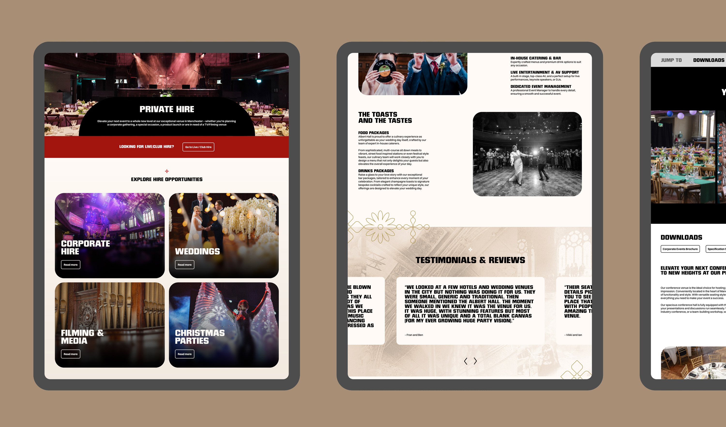 We developed a multimedia timeline to help show off the building’s history, sub-brand styling for their various private hire offers (weddings, corporate events and live hire) and a variety of outlets for their branded content – content-rich event pages, a powerful blog section and cross-promotion opportunities for their sister venues and F&B offers.