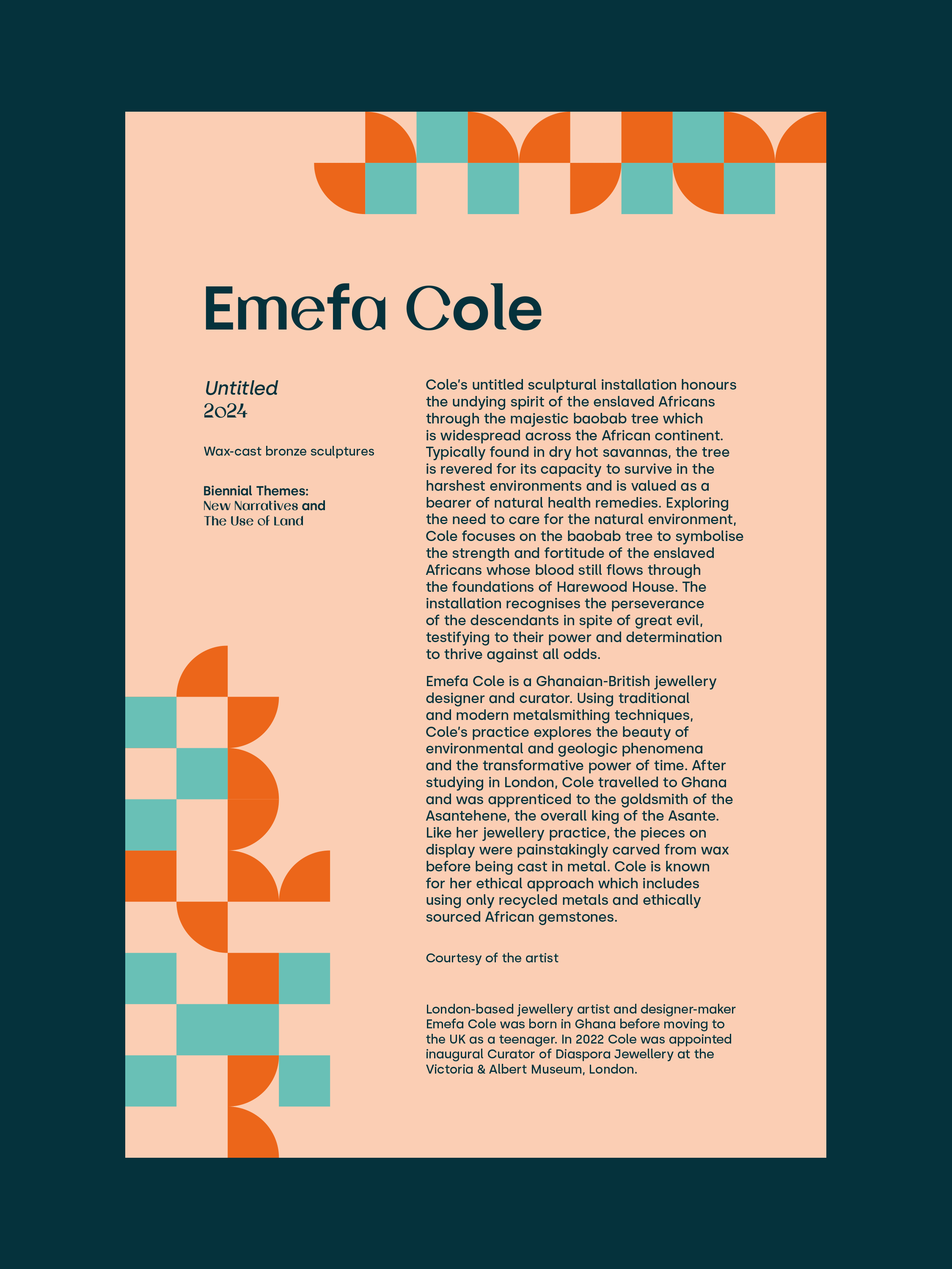 Create/Elevate showed how artists and makers work collectively to affect societal change and promote social equity. Exhibits encouraged fresh ways for audiences to engage the spaces and gardens of Harewood House.