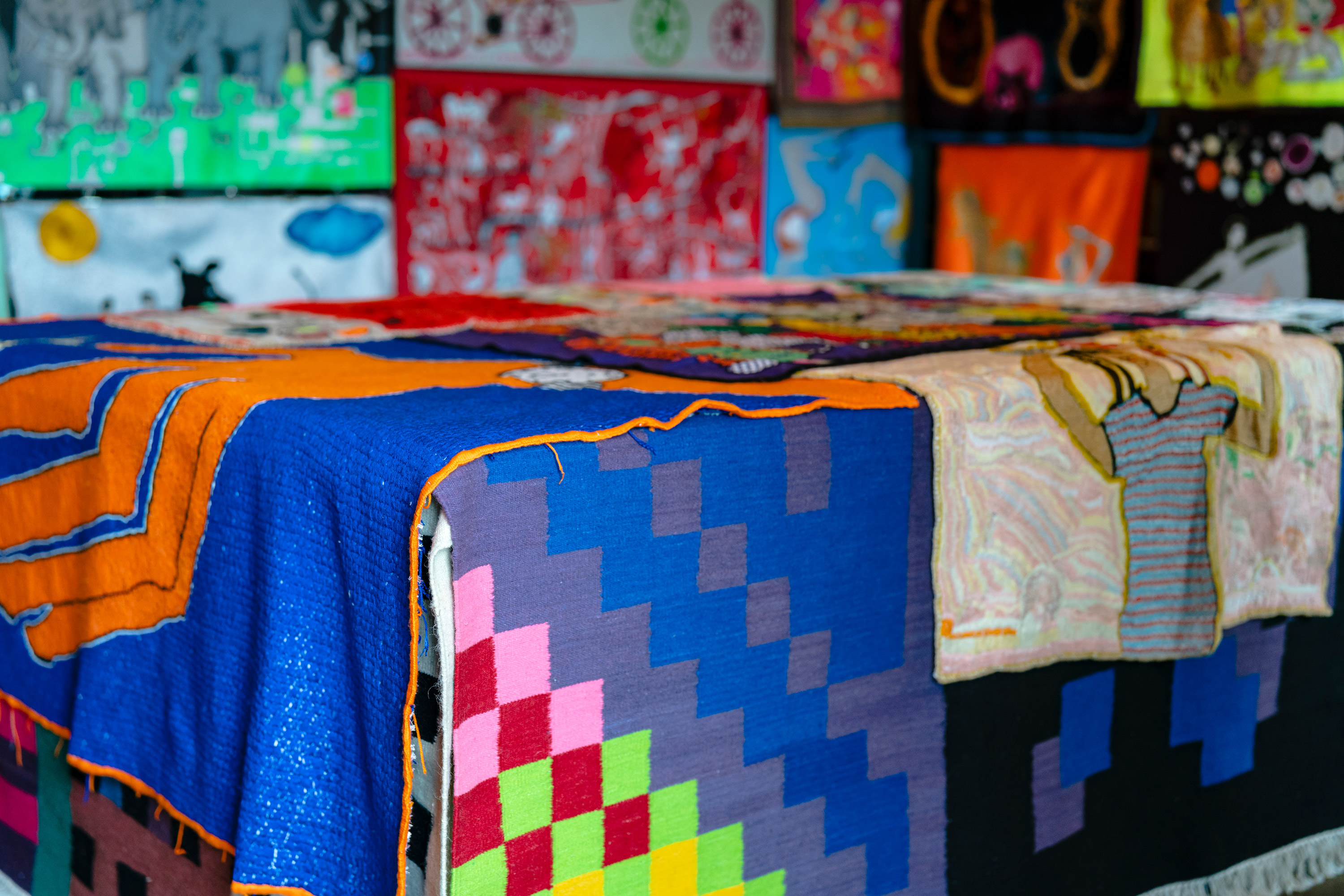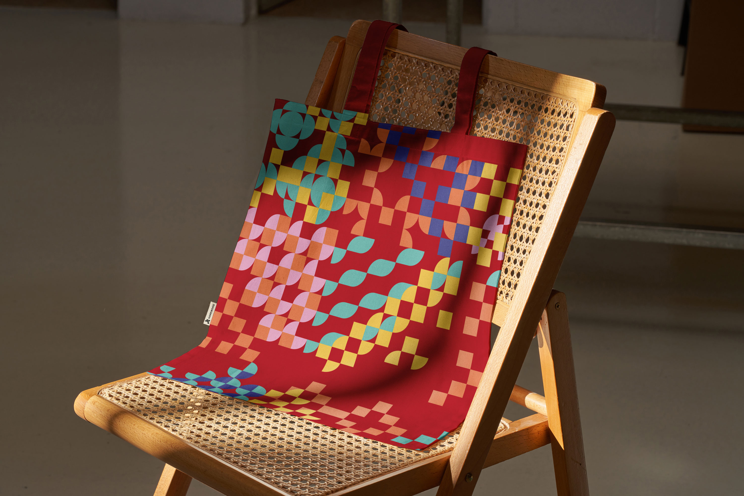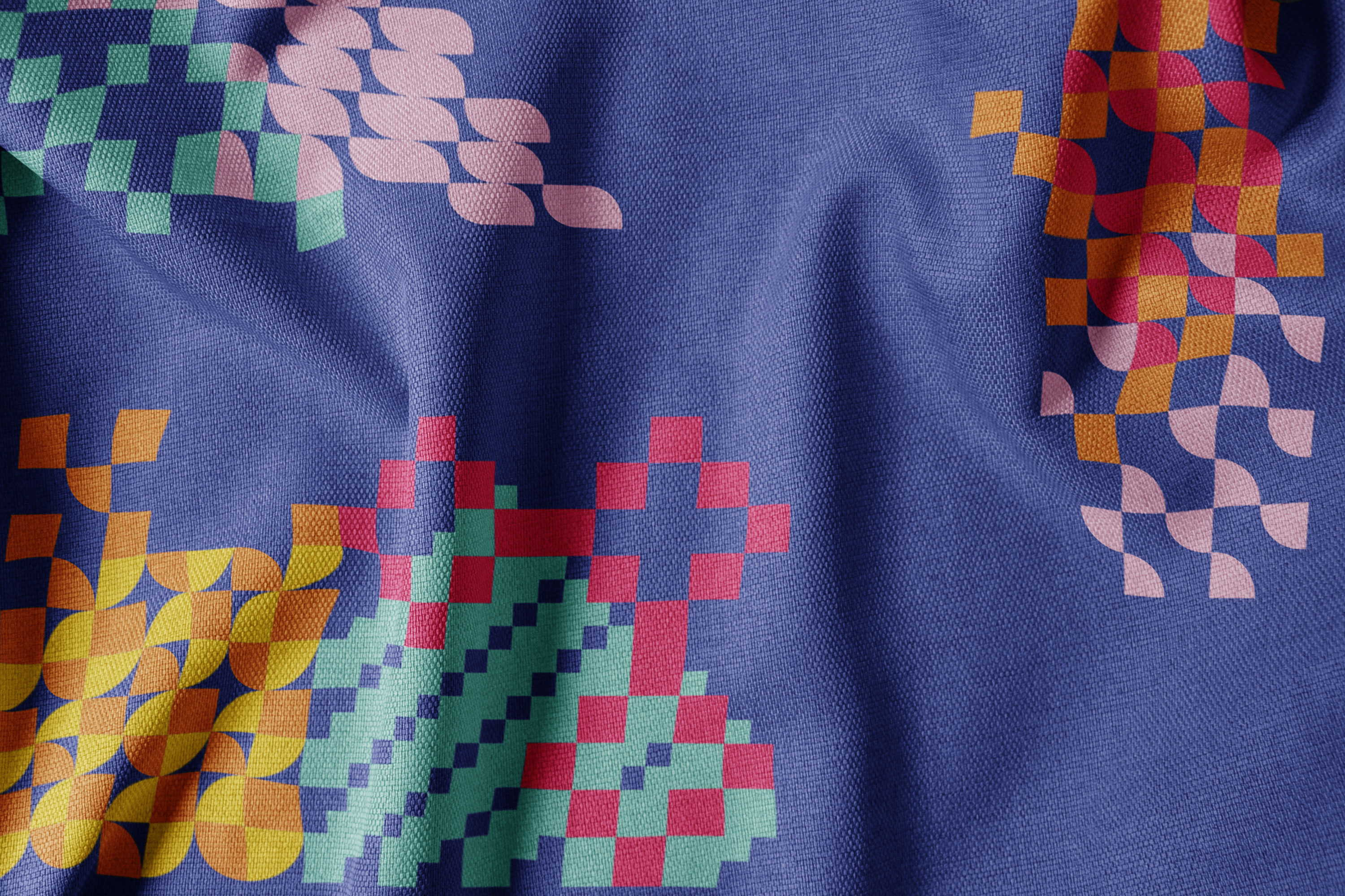 Taking reference from the negative space in the custom typography, we developed patterns based on a grid of quarter circles. These became a set of vibrant overlapping patterns, inspired by the rich layers of story, craft and colour on display.