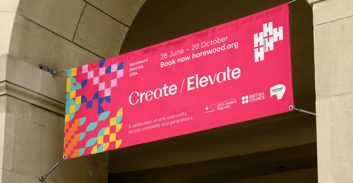The third edition of Harewood Biennial, Create/Elevate, celebrated the power of craft to surprise, inspire and bring people together to imagine new worlds. Working alongside curators Darren Phi and Ligaya Salazar we set out to build an identity for the 2025 edition of the biennial that is vibrant and accessible with a crafted, thoughtful approach.